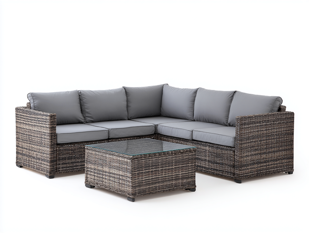 Set salotto da giardino completo con divano angolare e tavolino coordinato, pensato per l’uso quotidiano all’aperto.